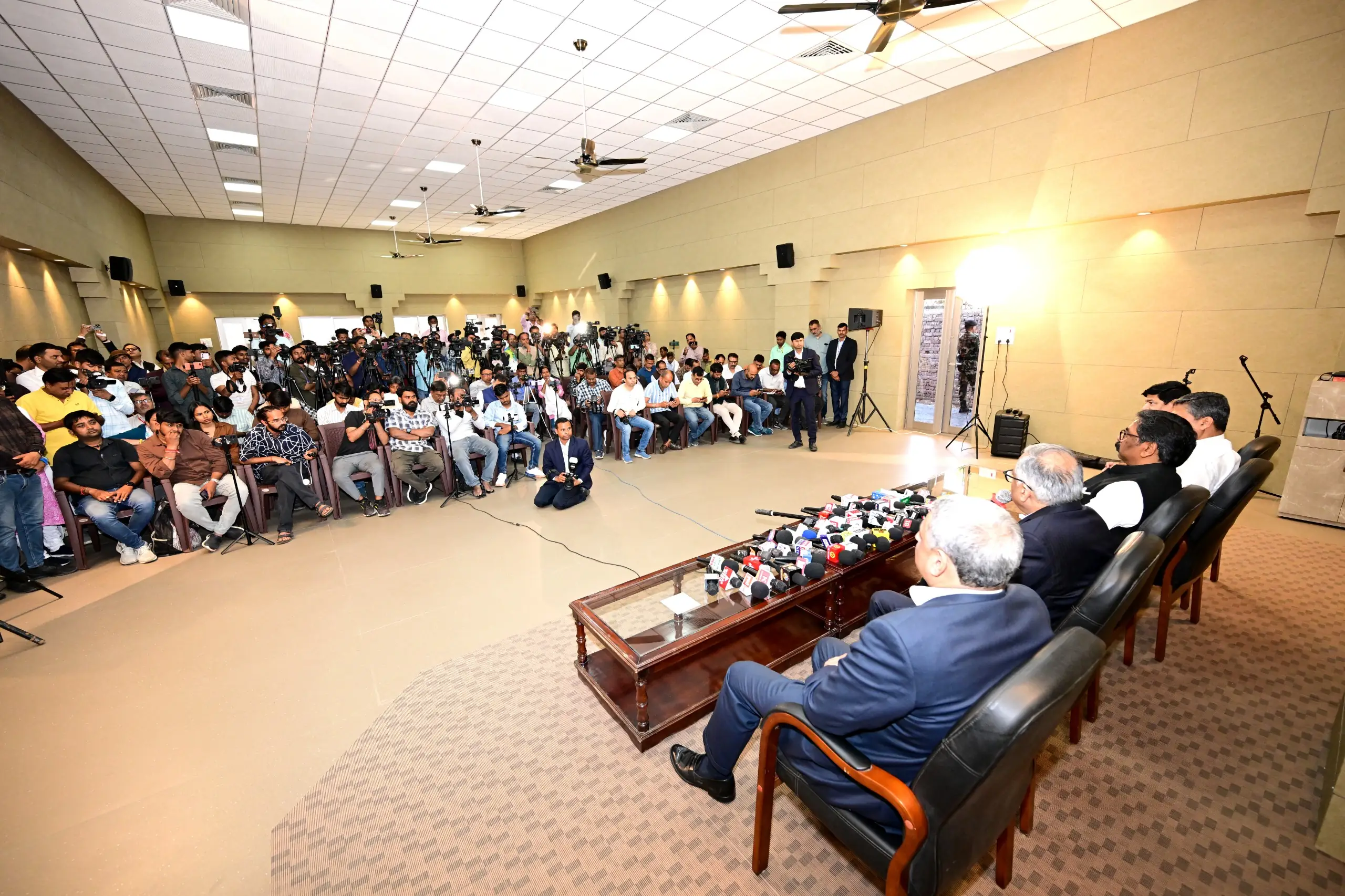 Chief Minister Shri Hemant Soren and Chairman of Tata Sons Shri N. Chandrasekaran addressing a press conference held at the Chief Minister’s Residential Office, Kanke Road.