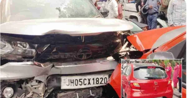 Three people sustained injuries following a forceful head-on collision between two cars near Jail Chowk in the Sakchi police station jurisdiction on Thursday afternoon. The accident happened as a resident, accompanied by his wife, was proceeding towards Jail Chowk from Old Court Road. At that precise moment, a speeding Tata Tiago with Bengal registration plates approached from the opposite direction and crashed directly into their car. The collision’s intensity triggered the airbags in both vehicles, preventing a more catastrophic event. According to onlookers, the front sections of both automobiles were extensively damaged. Among those injured were the wife of one driver, and a female passenger and a male passenger in the other car. With the help of nearby individuals, the injured woman and youth were taken to Tata Main Hospital for treatment. The wife of the first driver received prompt medical care at a local facility and was later released. Upon receiving notification, the Sakchi police team arrived at the crash site, removed the wrecked vehicles to clear the road for traffic, and commenced their inquiry. The driver involved stated that his wife and he were en route to the market when the fast-moving car collided with them, crediting the airbags for their survival.
