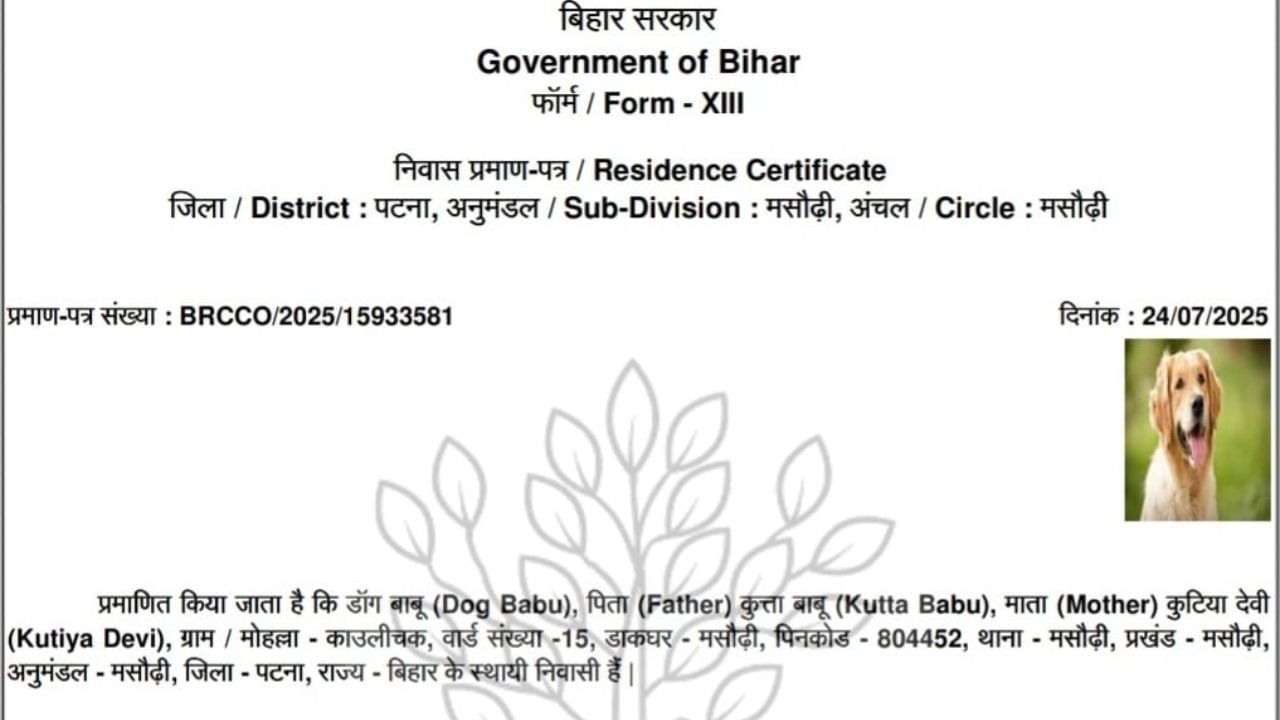 Authorities in Bihar are investigating the issuance of a residence certificate in the name of ‘Dog Babu,’ a case that has highlighted potential fraud within the administrative system. The certificate, issued by the Masaurhi zonal office, includes details such as the names of the ‘dog’s’ parents and a specific address. The discovery has prompted immediate action, with investigations underway and the possibility of disciplinary measures against involved officials. This incident mirrors previous instances of irregularities, including certificates issued under fictitious names or for inanimate objects.