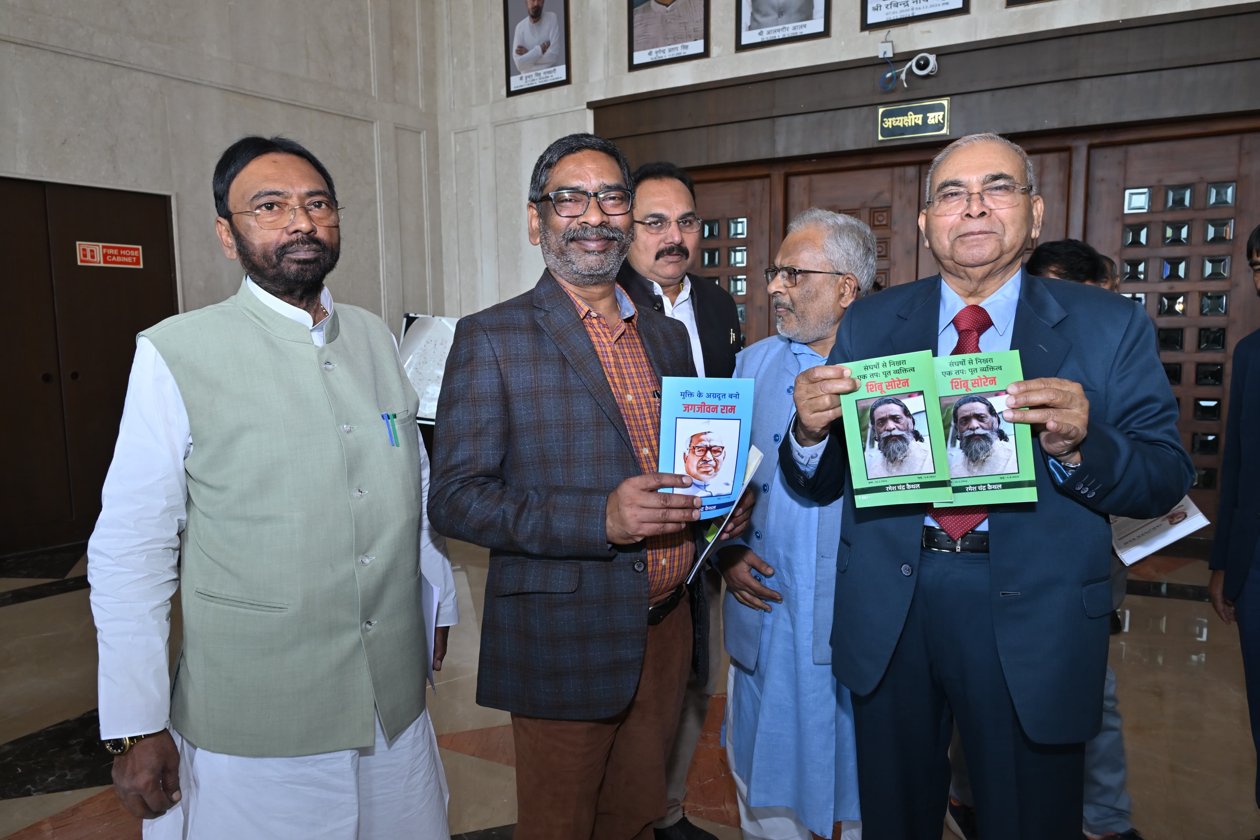 Chief Minister Mr. Hemant Soren was today called upon by Mr. Rajendra Prasad, Mr. Ramesh Chandra Kaithal and Mr. Naval Kishore Paswan at the Jharkhand Assembly. On this occasion, they respectfully dedicated books to the Chief Minister. These books include “A Tapasya Born from Struggles: A Complete Personality – Shibu Soren, Life and Ideology of Jagjivan Ram, Become a Pioneer of Liberation – Jagjivan Ram, and Maiku Ram – Smriti Granth.