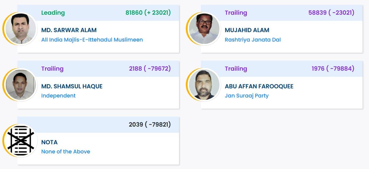 AIMIM has clinched the Kochadhaman assembly seat following a strong performance by its candidate, Md. Sarwar Alam. Alam secured a total of 81,860 votes, showcasing a dominant victory over his rival, Mujahid Alam from the RJD. The winning margin stood at a substantial 23,021 votes, with the RJD candidate receiving 58,839 votes. The Kochadhaman constituency, a general category seat within Bihar’s Kishanganj district, was created after the 2008 delimitation. It includes the entire Kochadhaman block and several gram panchayats from the Kishanganj block. Since its establishment, the Kochadhaman seat has a distinct electoral history, having been exclusively won by Muslim candidates. This trend was previously marked by JDU’s Mujahid Alam, who won a by-election in 2014 and retained the seat in 2015.
